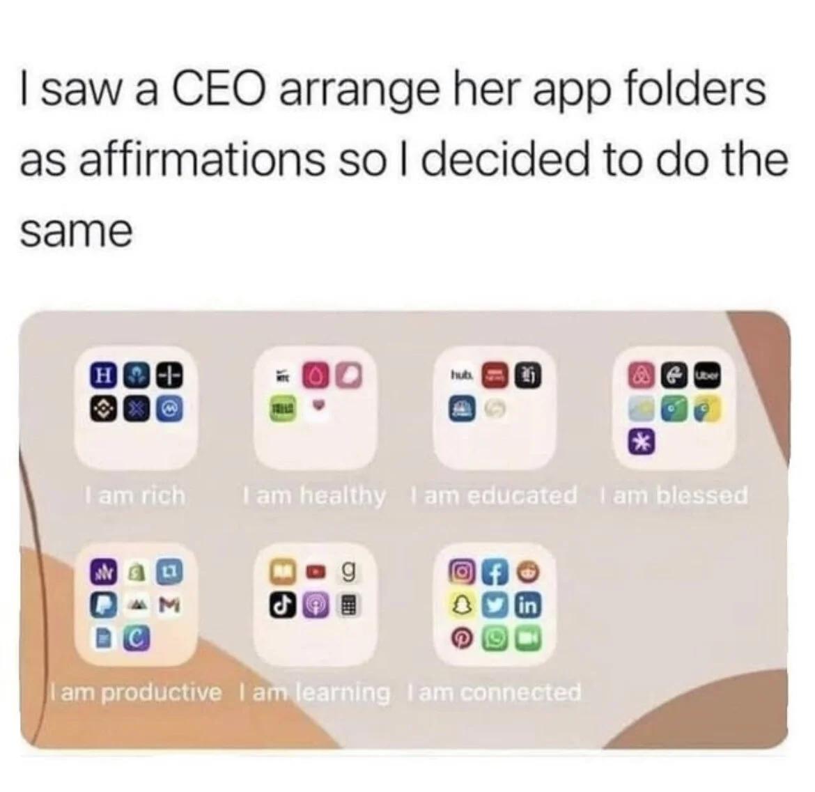 Here is a brilliant idea shared by the PepTalkHer instagram team that sparked a morning coffee break to do exactly this; Organize my phone apps into affirmations.
